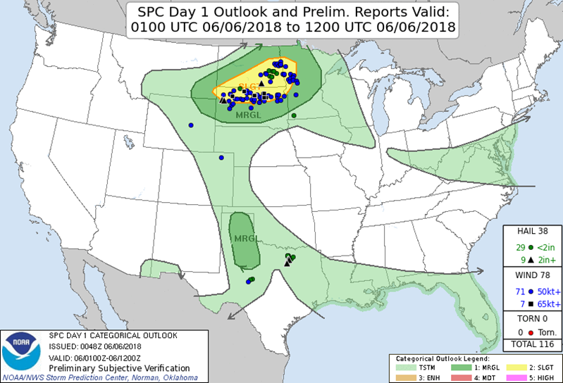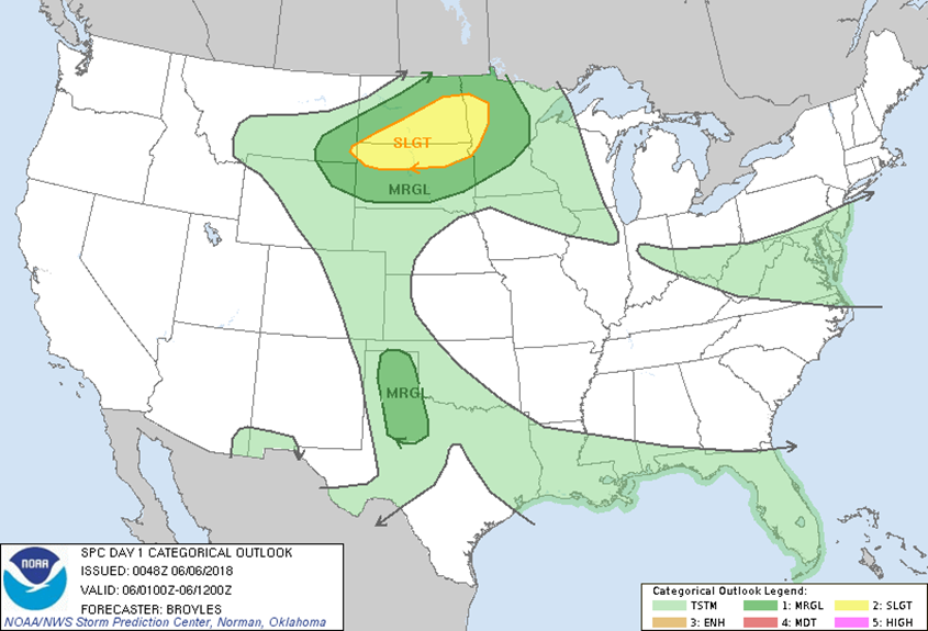 On June 5th, 2018 issued this outlook - outlining the best chance for storms in the Dakotas. Dallas is seemingly in the clear for anything severe. Only general thunderstorms (storms remaining below severe limits) were forecasted for the DFW metro area during this time frame.