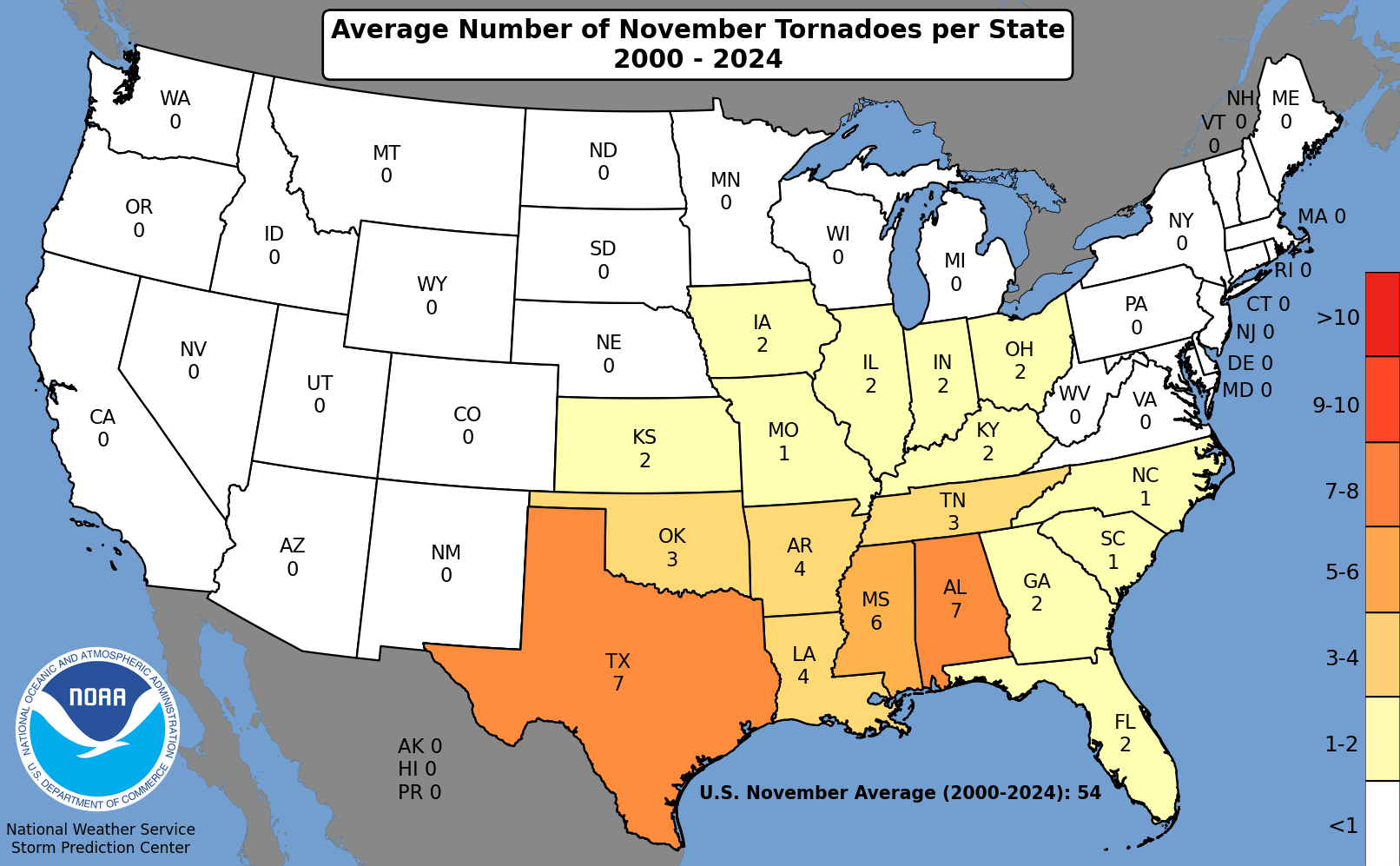 Over the last 25 years, you can clearly see where tornadoes are more likely to occur in November. Texas, Alabama, and Mississippi lead the states with the highest average for tornadoes in November.