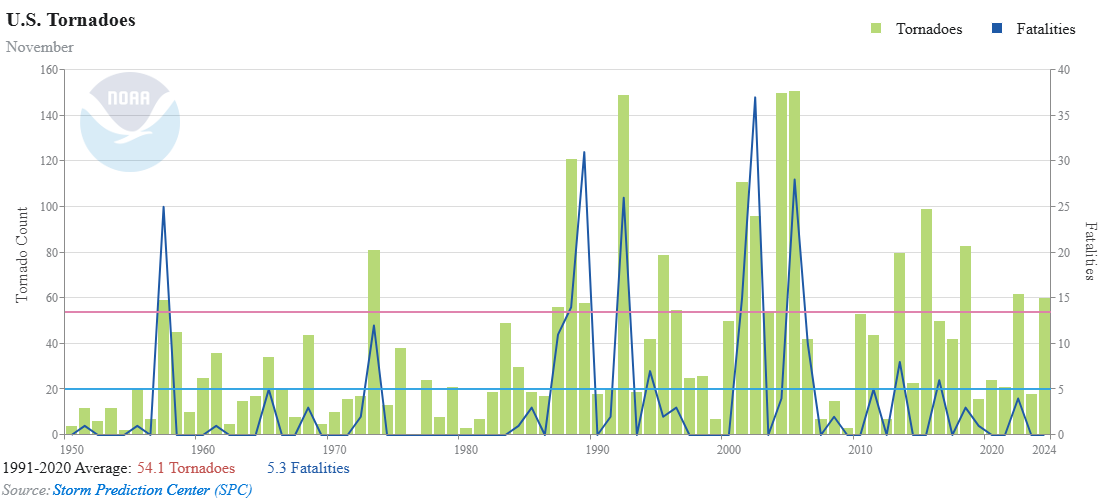 In the U.S., November has averaged 54 tornadoes per year, over in the last 24 years (2000-2024) according to the Storm Prediction Center. Some years in fact broke into triple digit territory with over 100+ tornadoes: – 1988, 1992, 2001, 2004 and 2005.