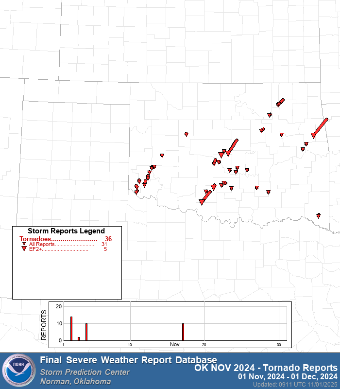 Most recently in 2024, Oklahoma set a new state record for the month of November where they had 36 tornadoes officially reported. This shattered the states previous record of 12 set back in 1958.