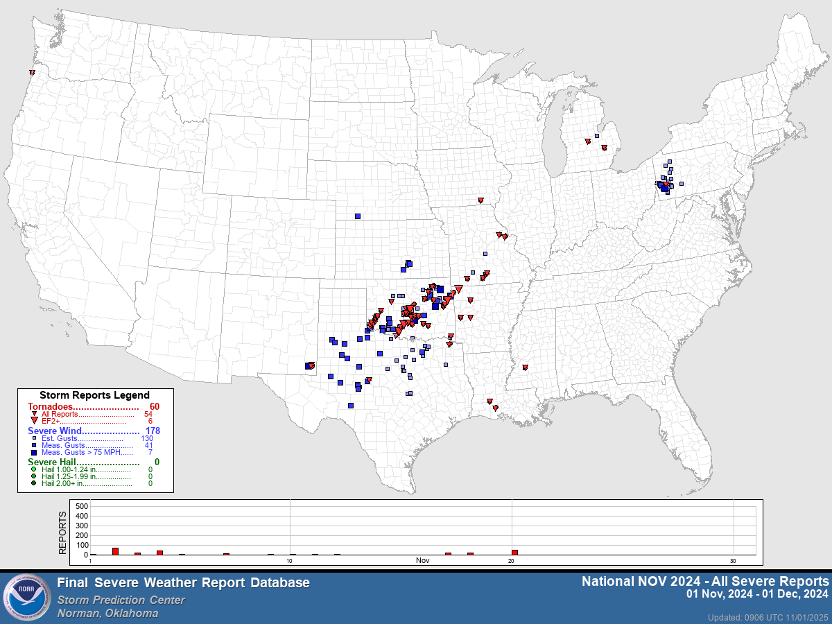 This brought the total tornadoes in November 2024 to 60, with the most action occurring in Oklahoma. Of these 60 tornadoes, 6 of them were considered strong tornadoes, that means the tornado received a rating of EF2 or greater.