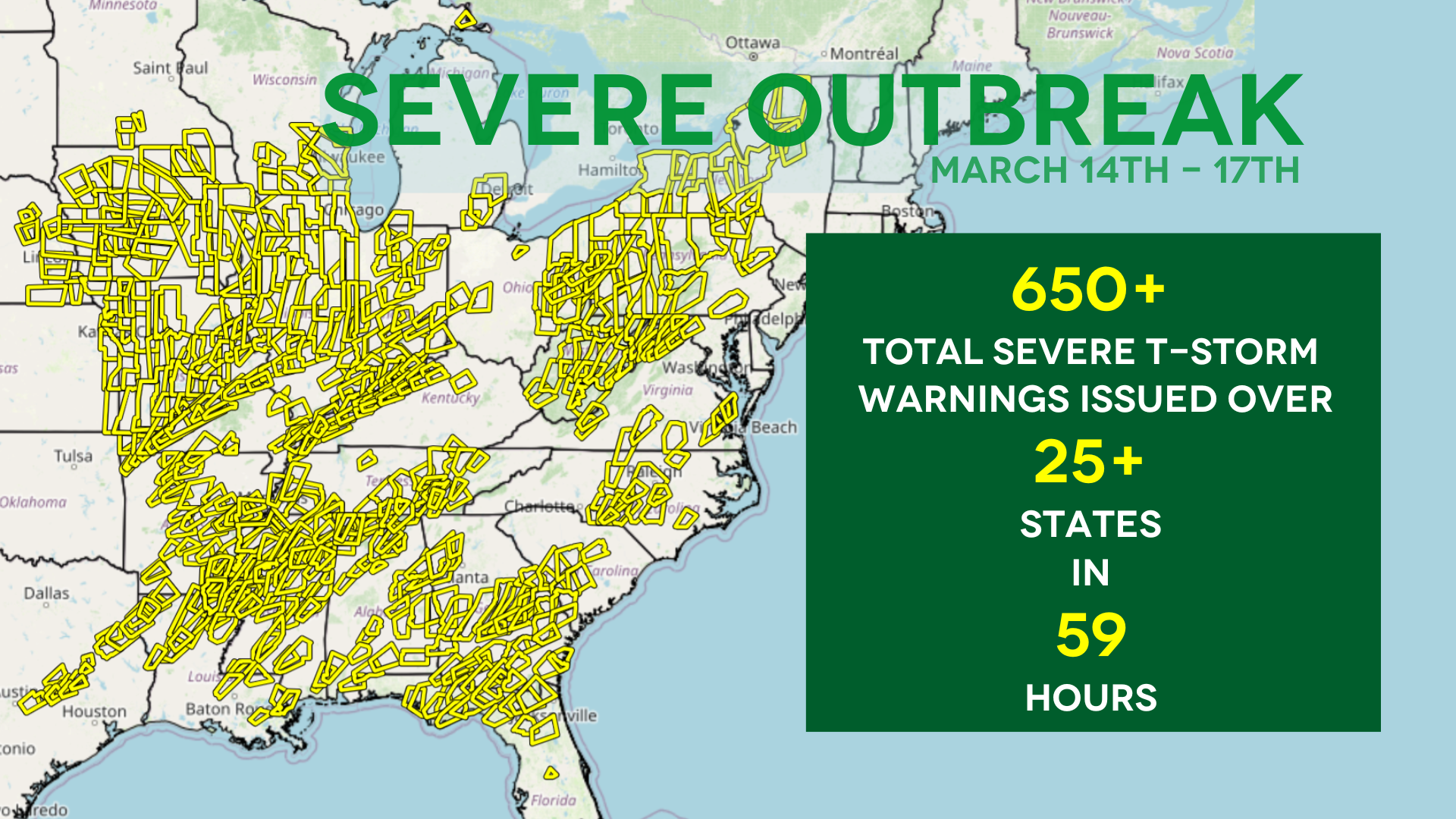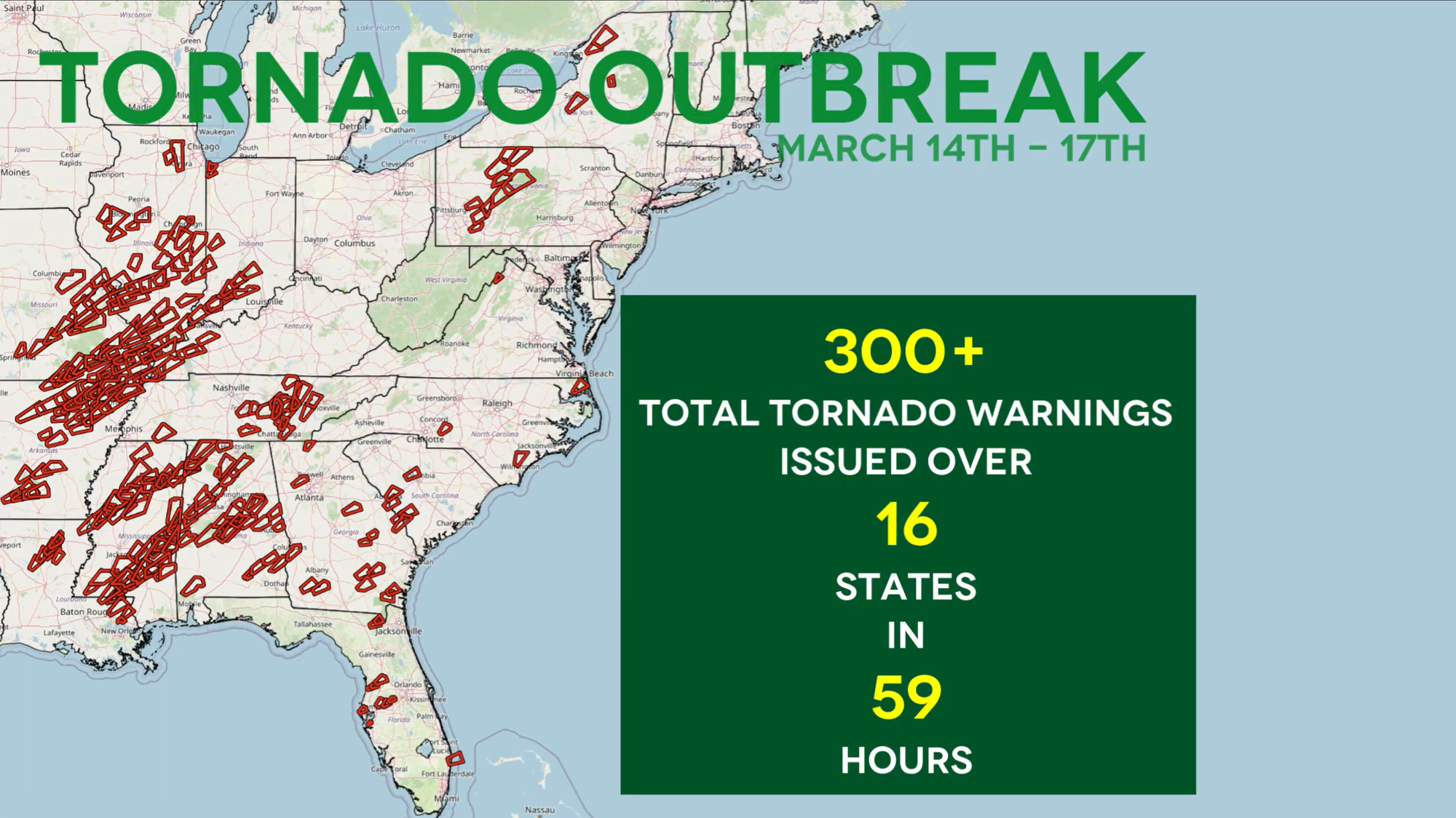 On top of the severe thunderstorm warnings, the SPC released over 300 tornado warnings during the three-day outbreak.