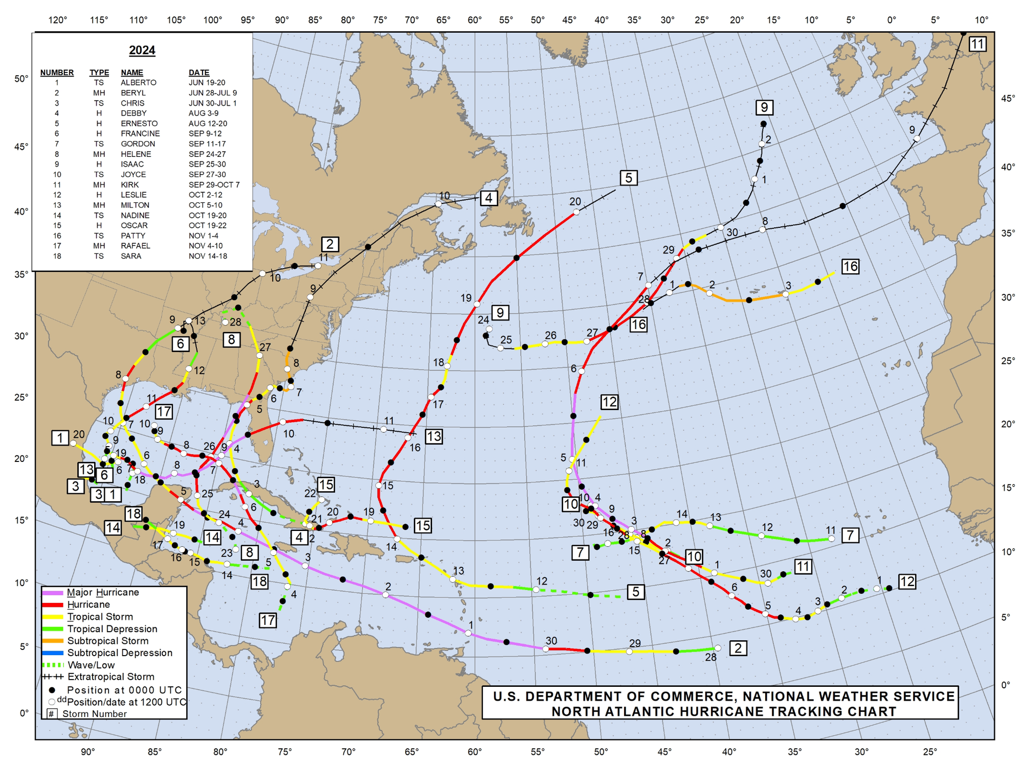 The 2024 Hurricane Season saw 18 named storms, four of which reached Category 3 or greater. Five of those tropical cyclones--Beryl, Debby, Francine, Helene, and Milton--made US landfall as hurricanes between June 28th and October 10th.