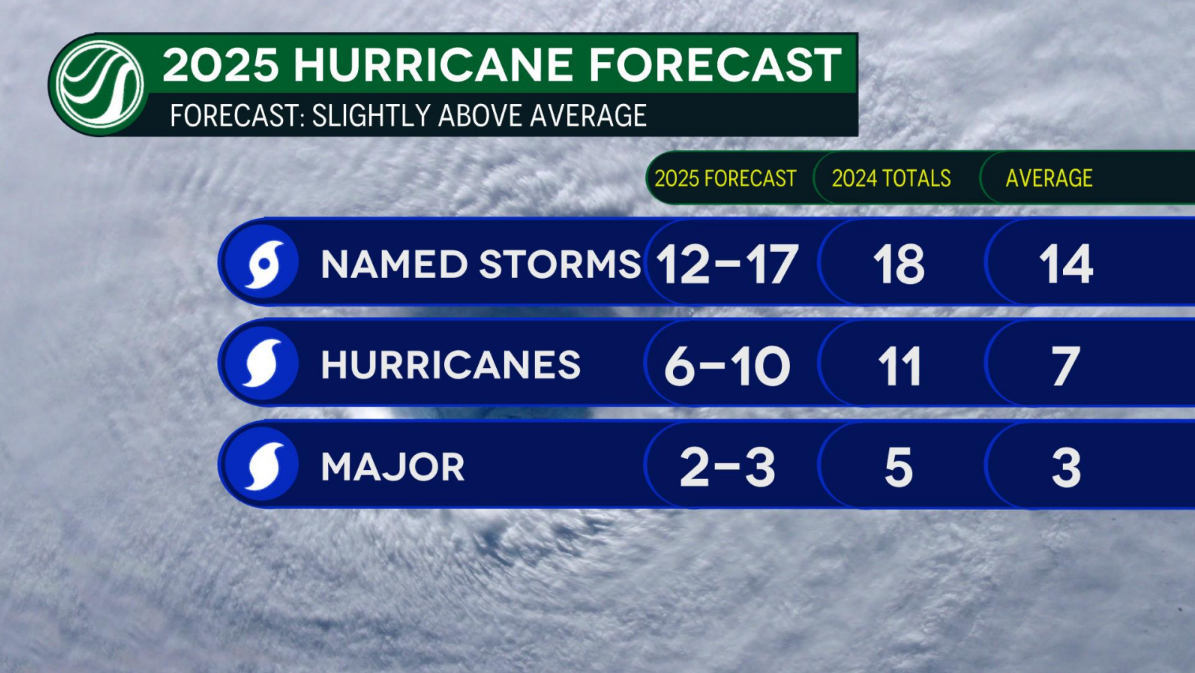 Derik forecasted a fairly average to slightly above-average hurricane season. With a forecast of 12-17 named storms in 2025, this hurricane season would rank just behind last year. Nonetheless, a potential for 6-10 hurricanes, 2-3 of which could be major hurricanes, would keep the 2025 season well on pace with historical averages.